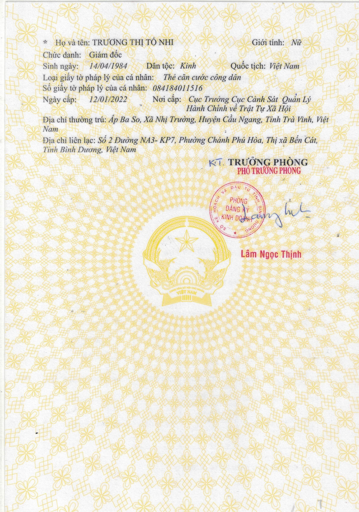 Người đại diện: bà TRƯƠNG THỊ TỐ NHI